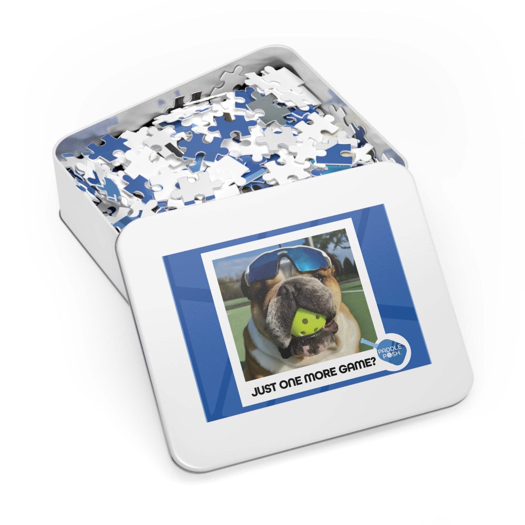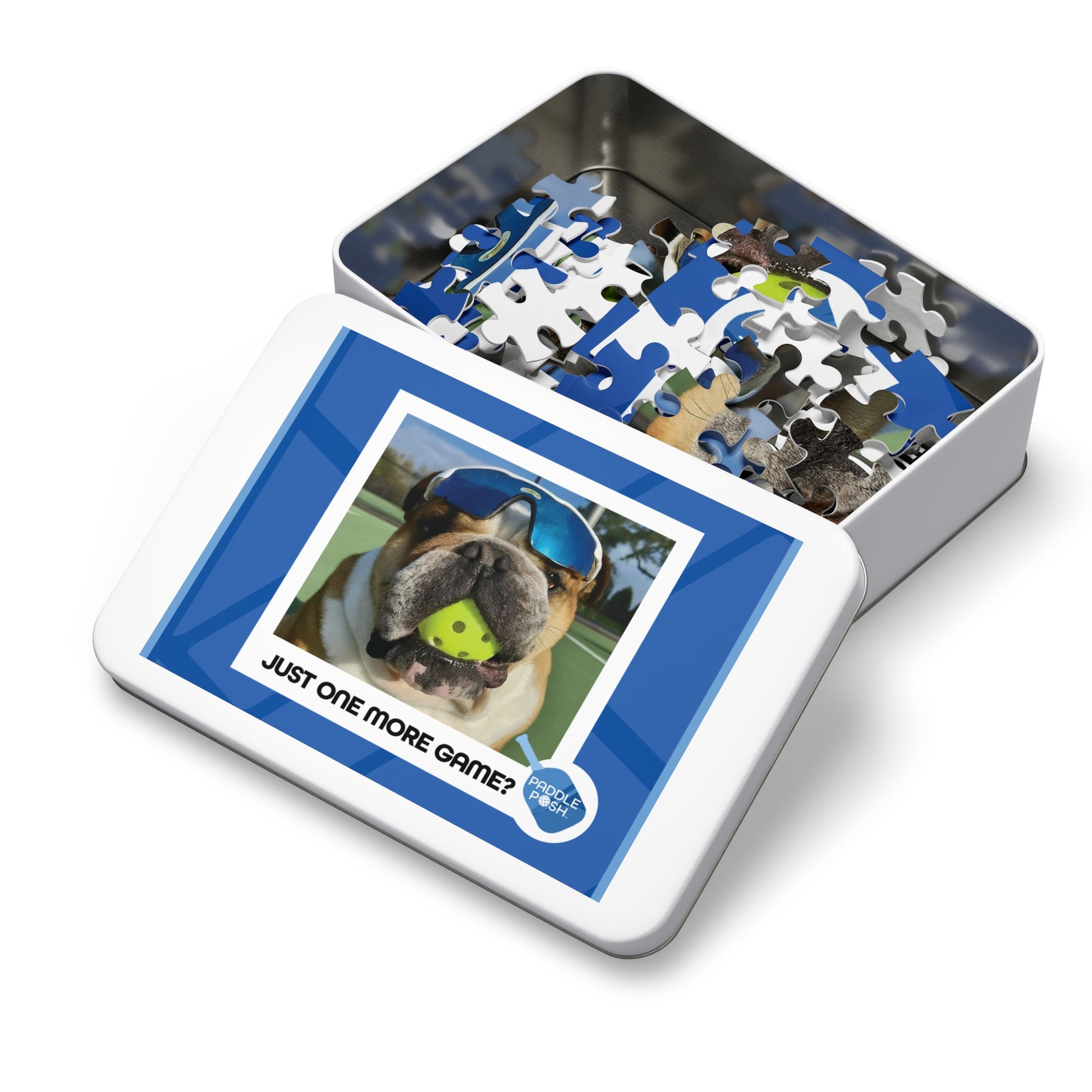 Jigsaw Puzzle: Pickleball with English Bull Dog in Metal Tin Box